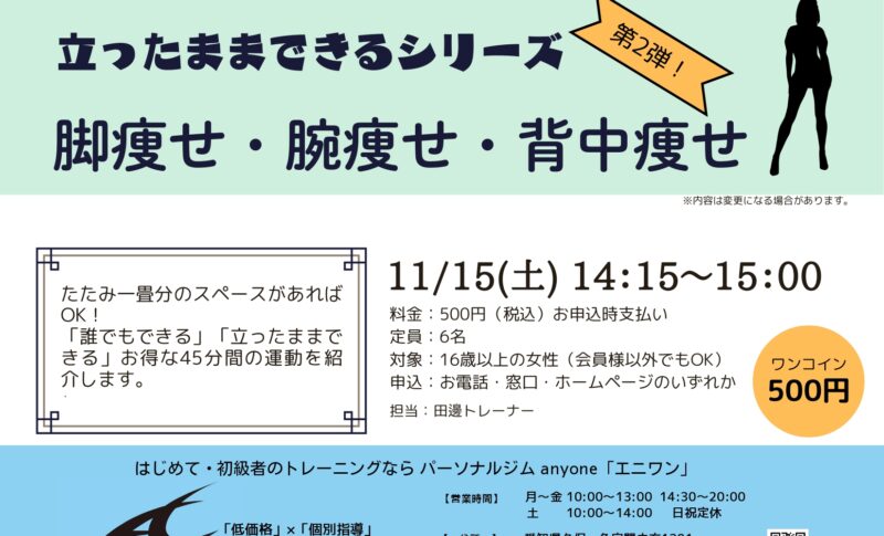 料金:500円(税込)持ち物:運動の出来る服装でお越しください(更衣室で着換えも可)。※デニムパンツ、スカート、ベルトが必要なもの等はNG。シューズは必要ありません。飲み物&タオルもお忘れなく。