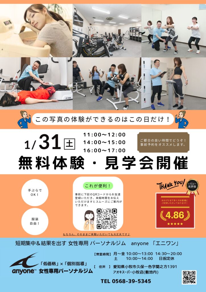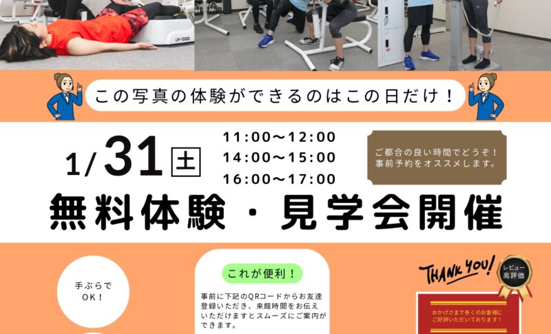 →ご案内できる時間は、11:00~12:00 14:00~15:00 16:00~17:00の3回です。お電話・チラシ内のLINEのQRコードからお申込いただくか、下記の体験トレーニングのフォーマットから進んでいただきその他の欄に「体験会〇〇時希望」とご入力ください。また、お電話や店舗での直接のご予約も可能です。