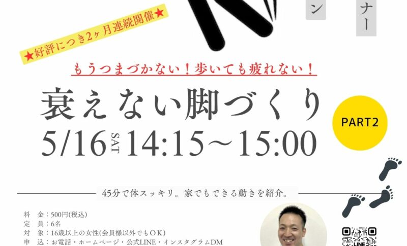 先月、開催した「衰えない脚づくり」が大変好評でしたので、2ヶ月連続で開催することにしました!