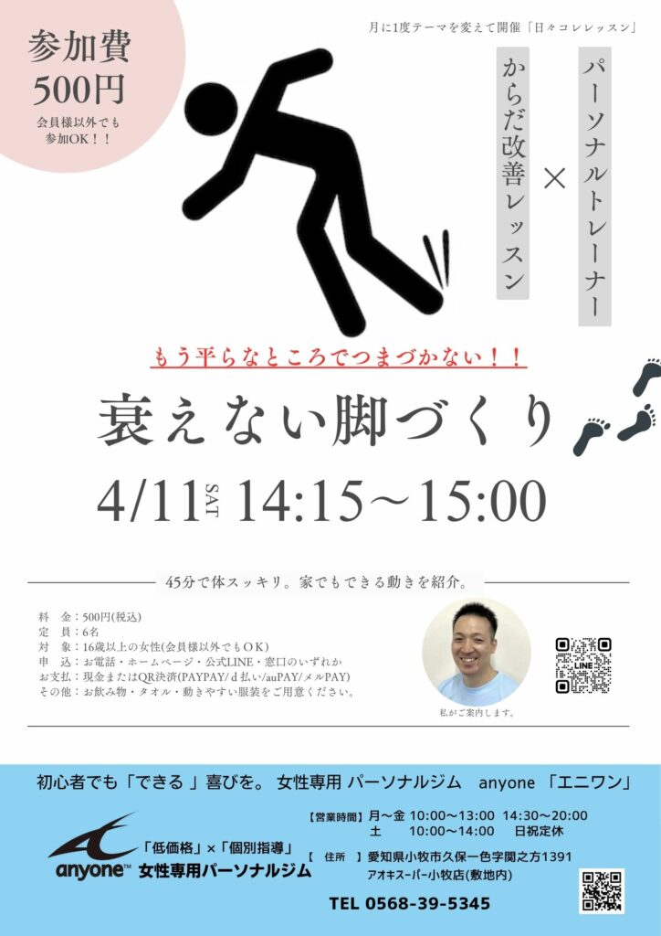 「もう平らなところでつまづかない!衰えない脚づくり」は4/21(土)開催♪