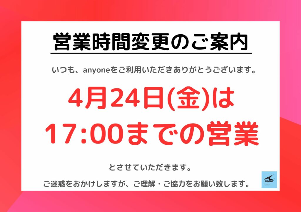 来たる4月24日(金)は諸事情により17:00までの営業とさせていただきますので、ご理解のほどよろしくお願い致します。