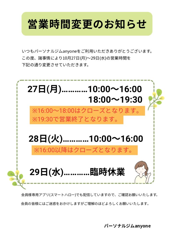 この度、諸事情により10月27日(月)~29日(水)の営業時間を下記の通り変更させていただきます。