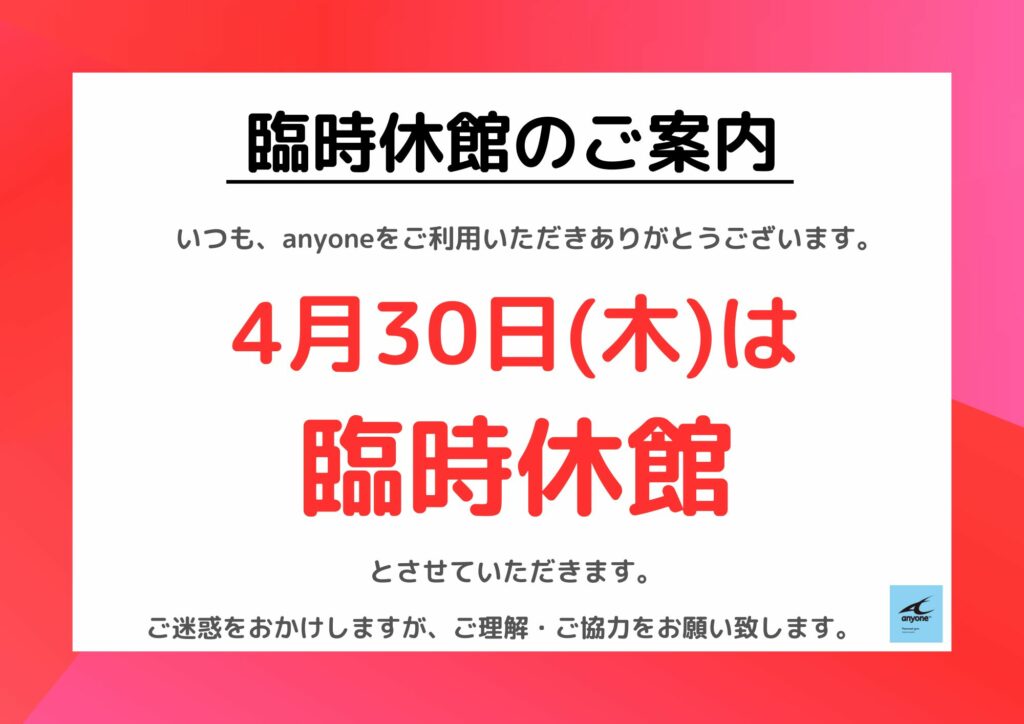 来たる4月30日(木)を臨時休館日とさせていただきますので、ご理解のほどよろしくお願い致します。